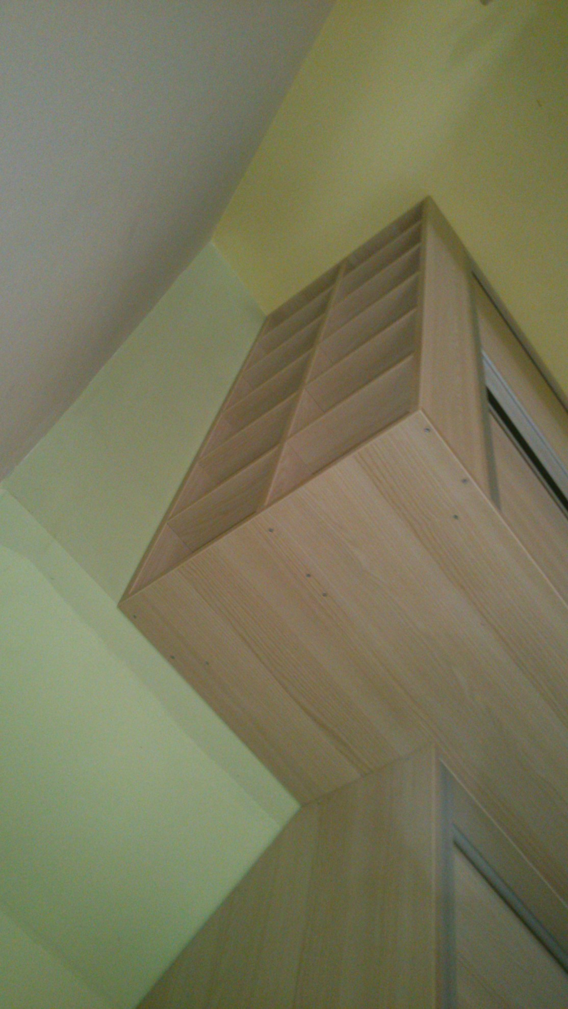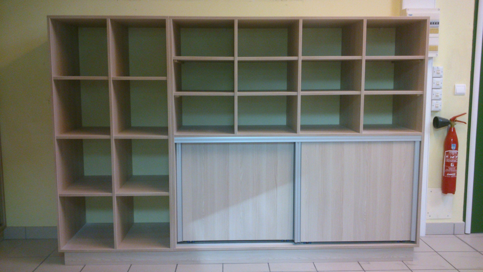 Rangements sur mesure pour l’école primaire de Saint-Sixt, comprenant différents casiers et des portes coulissantes.